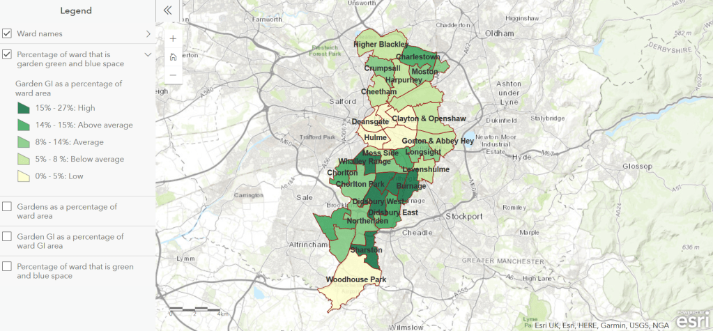 Domestic gardens cover a significant proportion of the total area of Manchester, with around one fifth of Manchester’s land area being gardens. The average proportion of domestic gardens to total ward area is 22-26%. This ranges between 0.5% (City Centre) to 47% across Manchester’s wards.